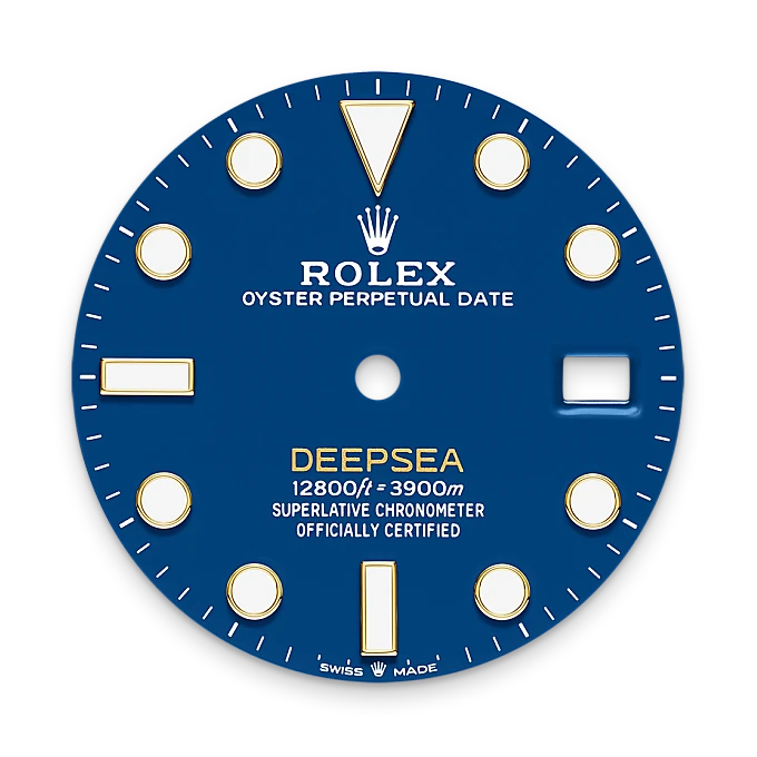 The 60-minute graduated, unidirectional rotatable bezel of the Rolex Deepsea enables divers to precisely and safely monitor their dive and decompression times. The triangular �zero� marker of the graduation is visible in the dark thanks to an embedded capsule containing a luminescent material emitting a long-lasting blue glow. The graduation on the bezel is coated via PVD (Physical Vapour Deposition) with a thin layer of yellow gold. The blues found in the compression ring, the dial and the Cerachrom bezel insert combine to create a subtle oceanic palette that is accentuated by the 18 kt yellow gold of the case and the Oyster bracelet.